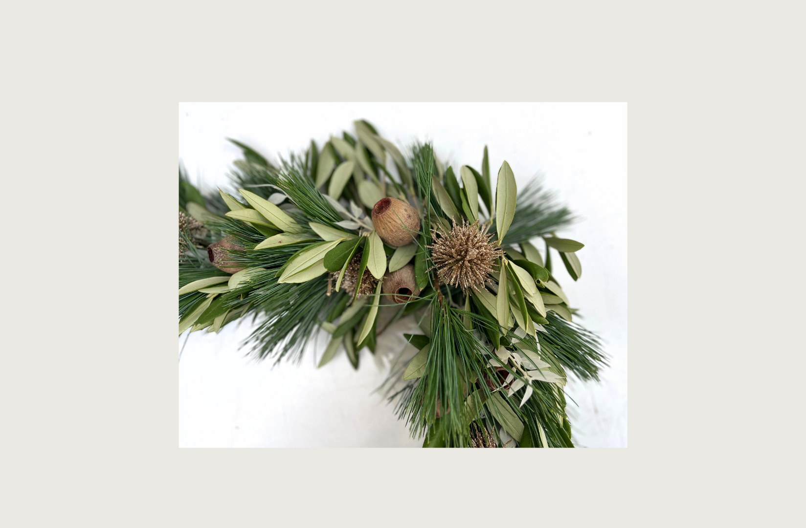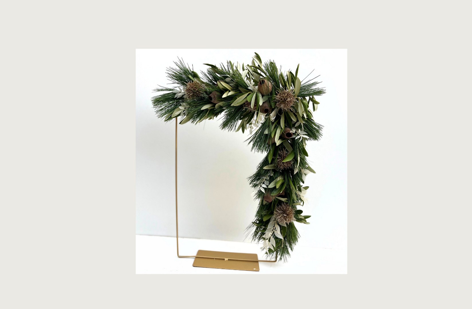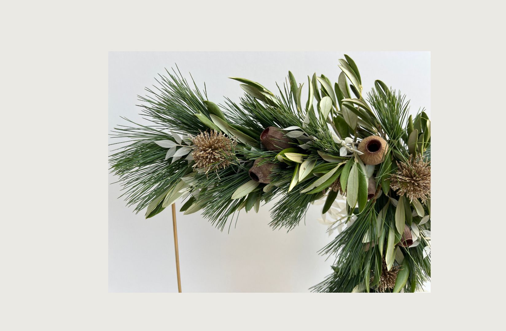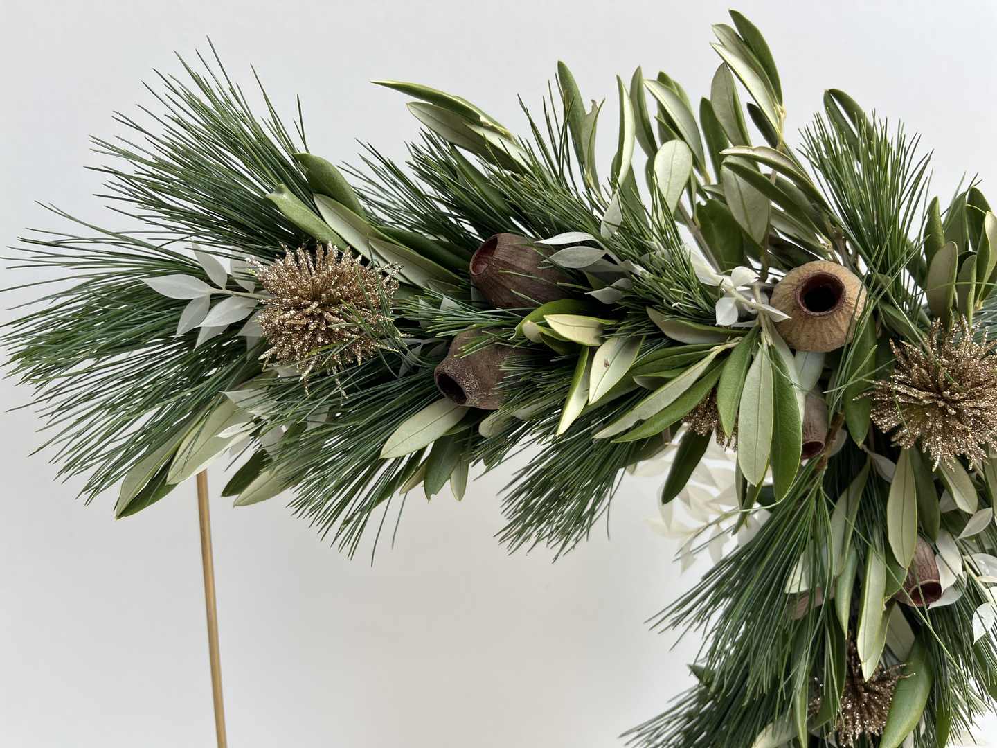 Materialen: frame, pinus, olijfblad, gouden bolletjes, cupjes, ruscus.
