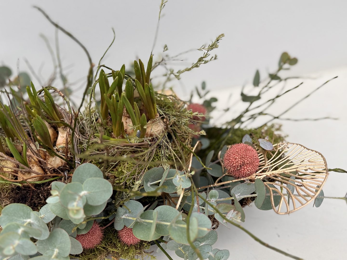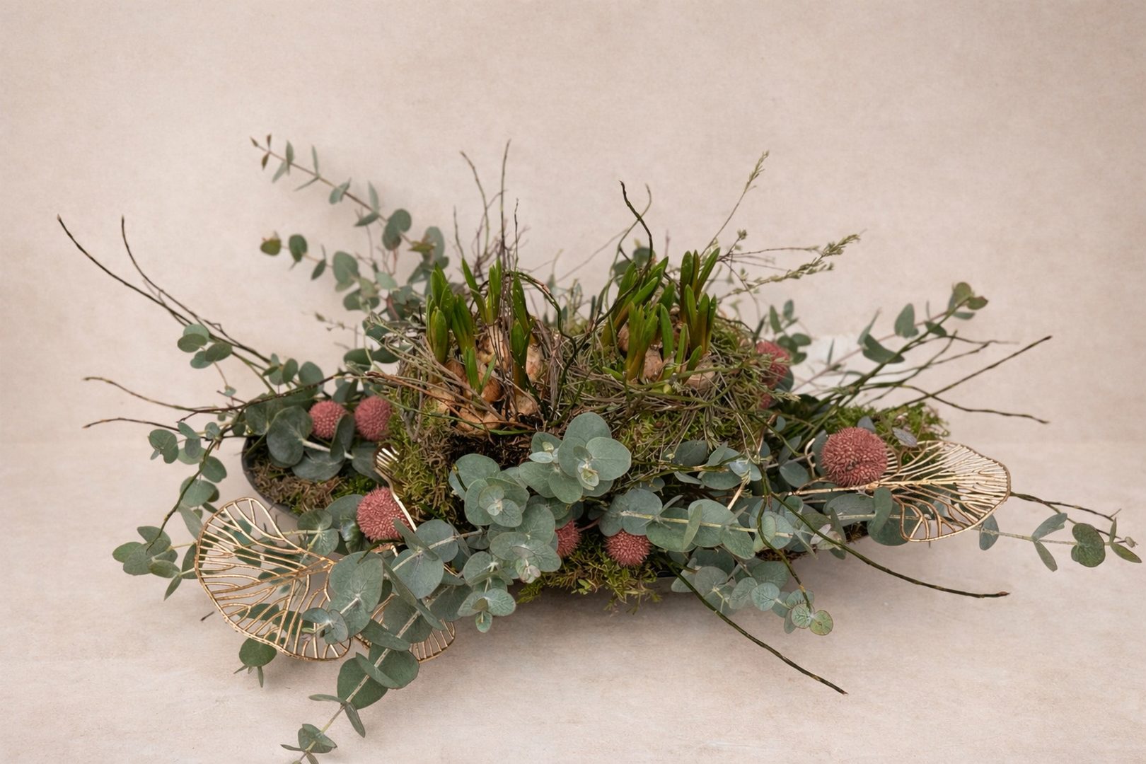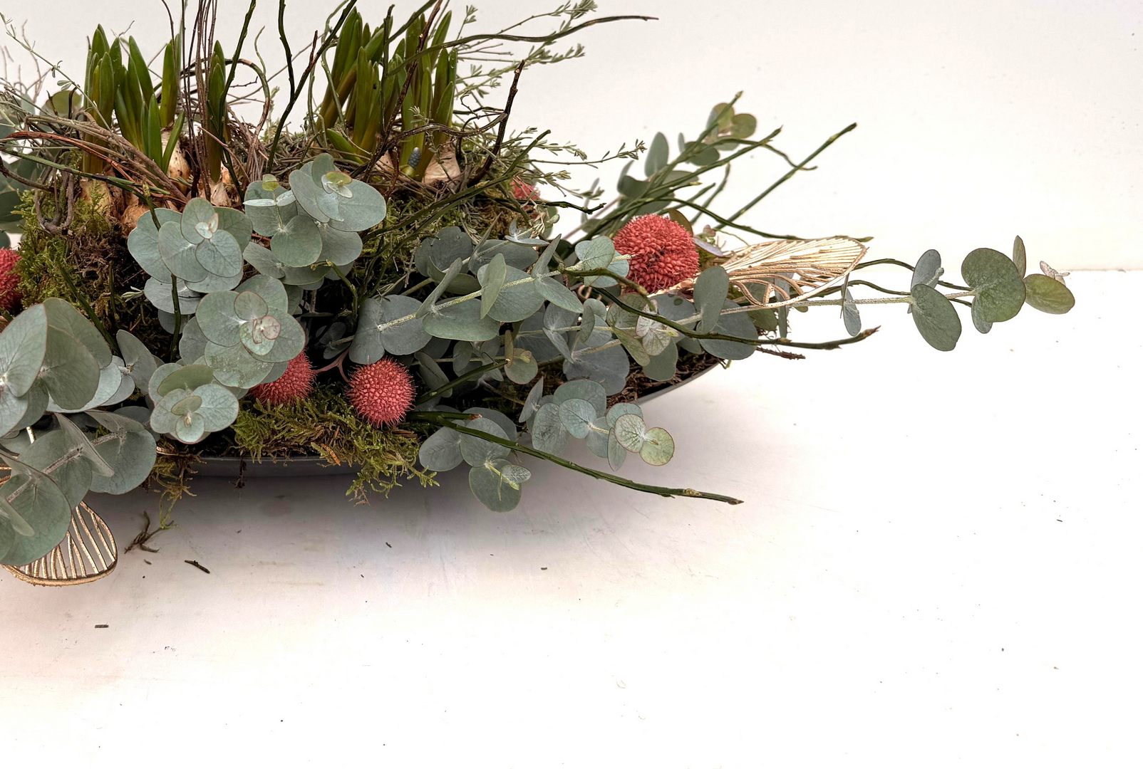 Materiaal: een ovale donker grijze schaal, mos, blauwe druifjes, cinerea, bosbes, gouden waaier, acasiabolletjes en thijm.
