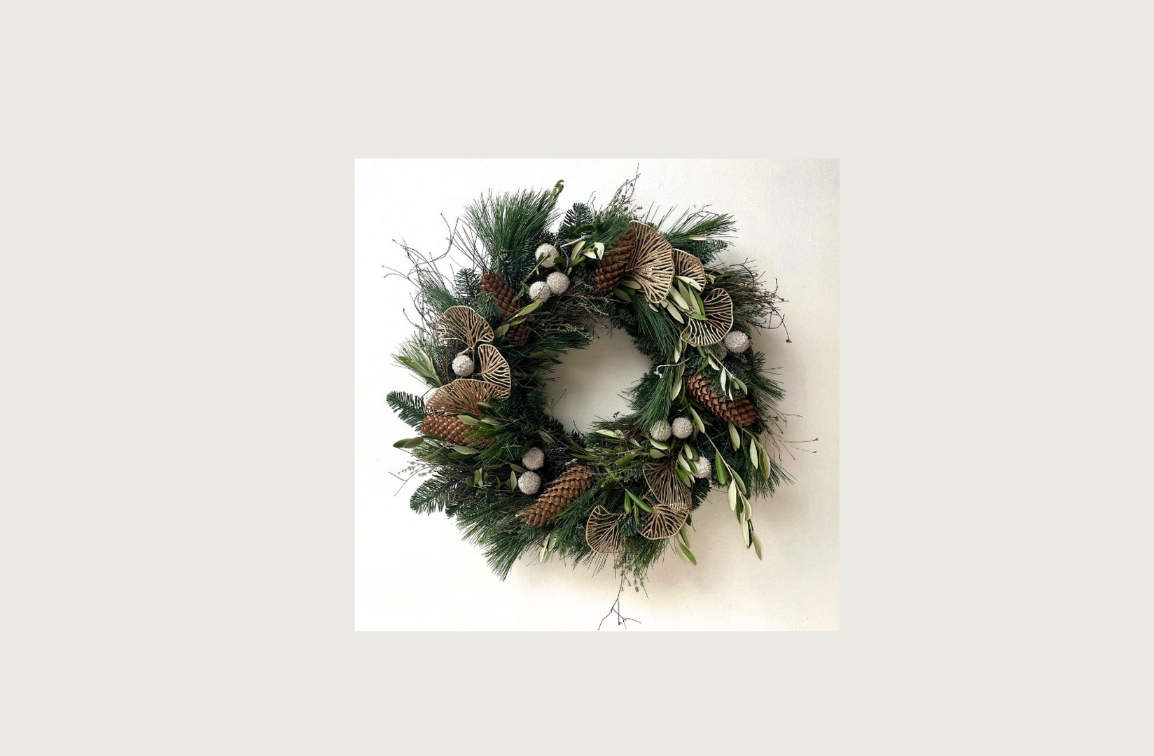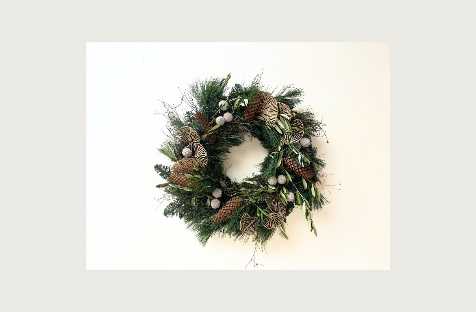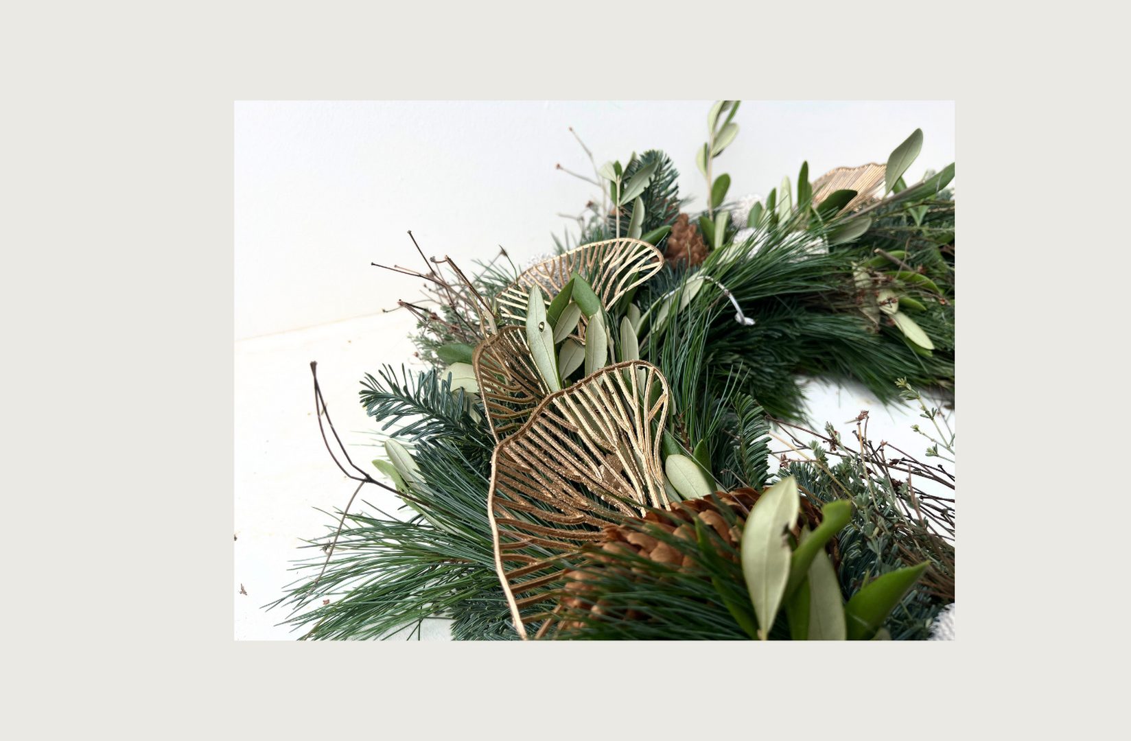 Prachtige Winterkrans met div soorten groen en gouden waaiers.