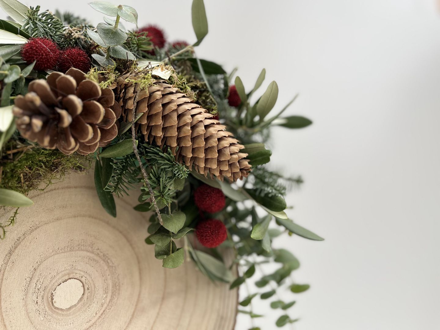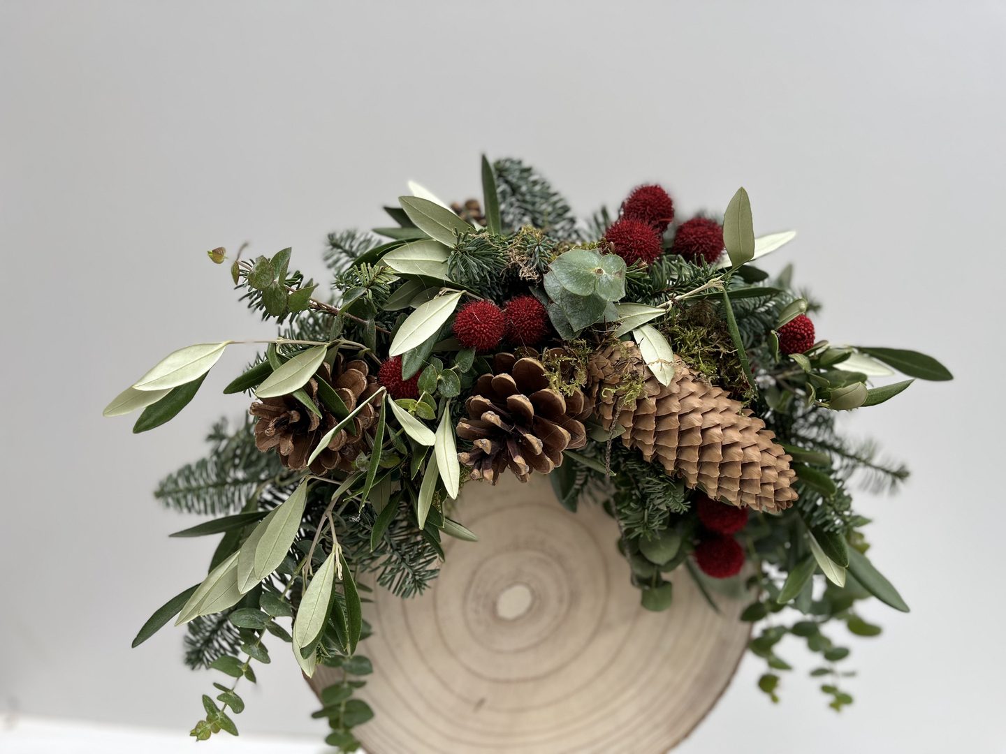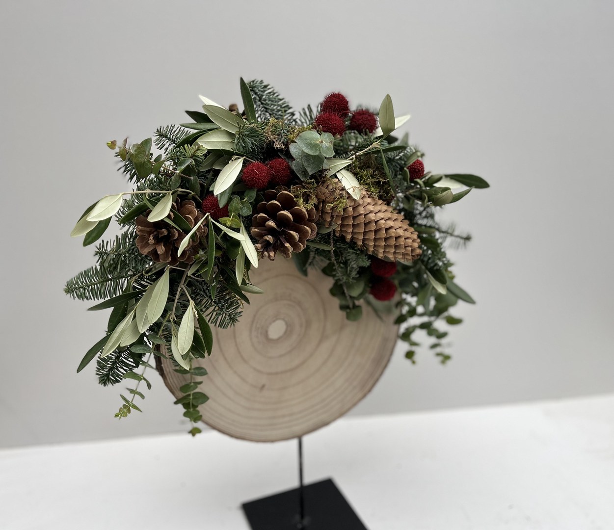 Materiaal: boomschijf op voet, oasis, rode balletjes, baby blue, nobillis, olijfblad, 2 soorten dennenappels, mos.