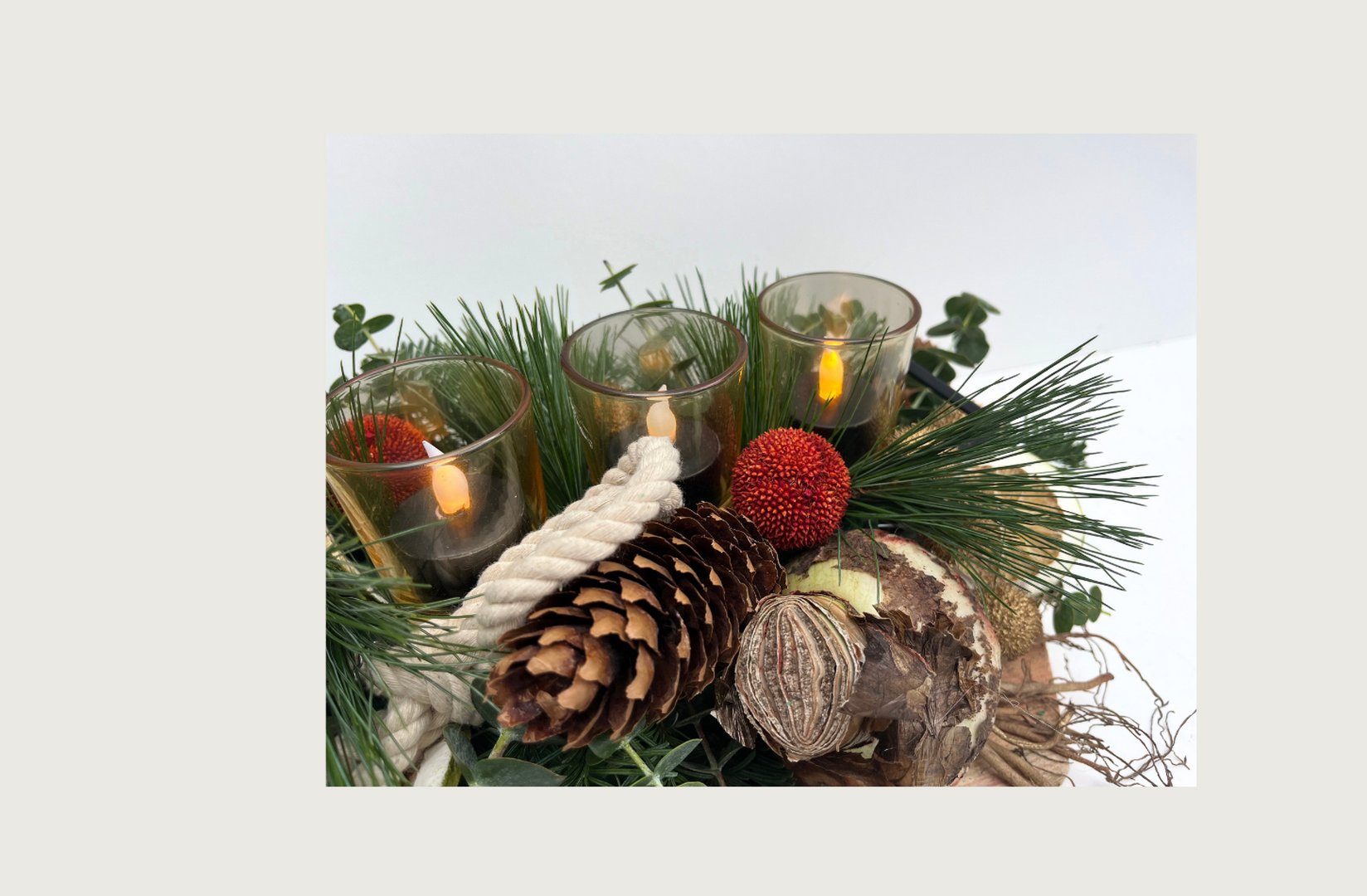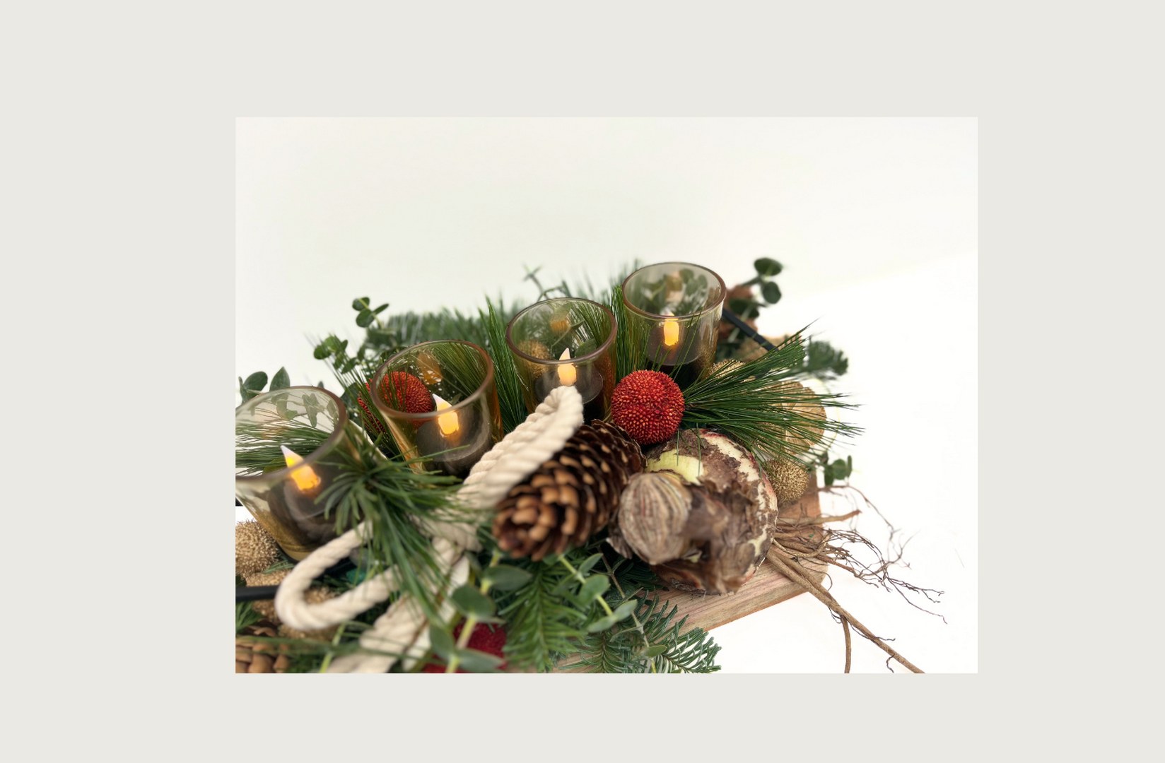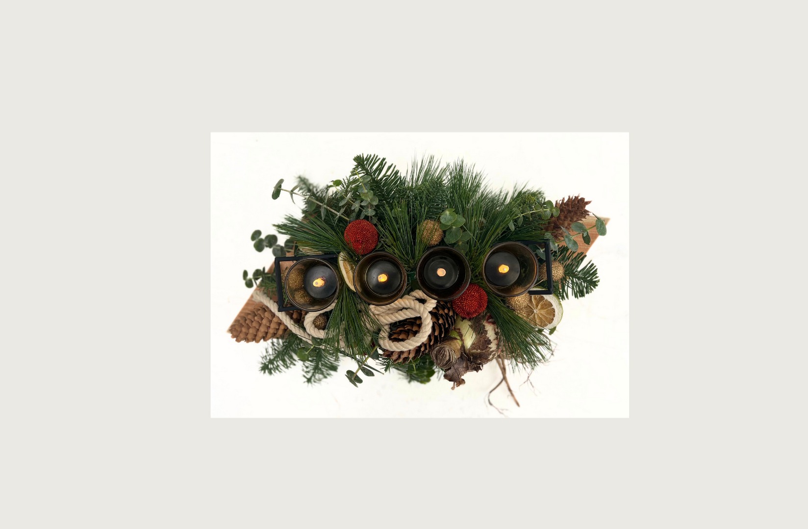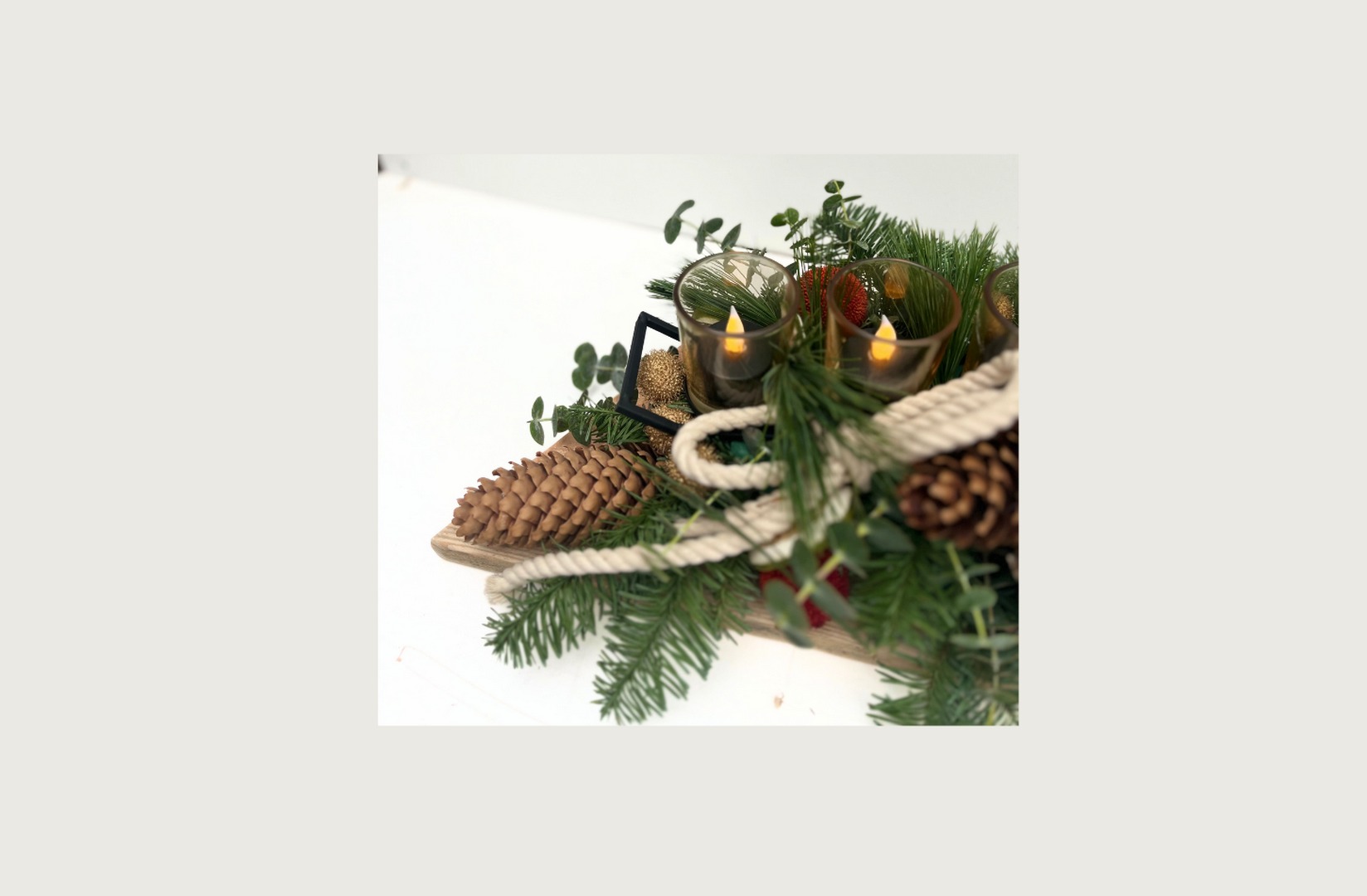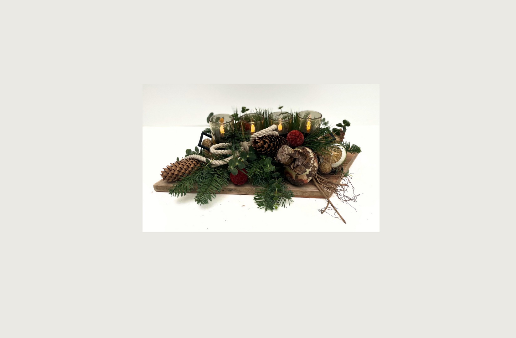 Materiaal: plank, frame met glaasjes, touw, nobillis, baby bleu, pinus, acasiabollen goud en rood, amaryllisbol, sinaasappelschijfjes, oasis en krammen (excl. kaarsjes).