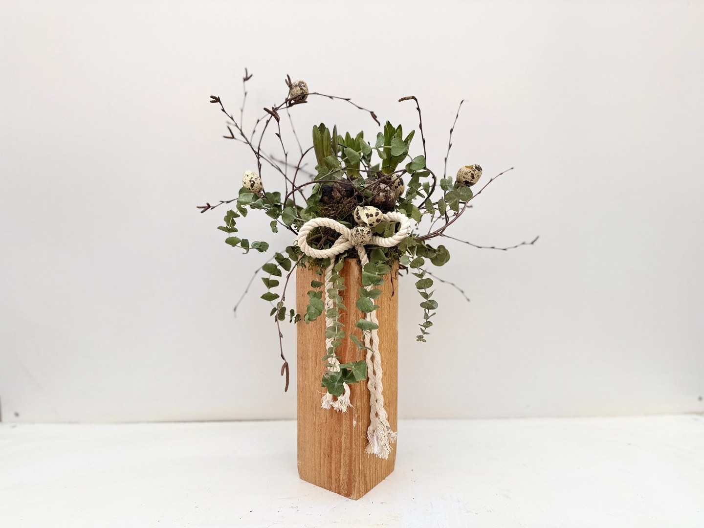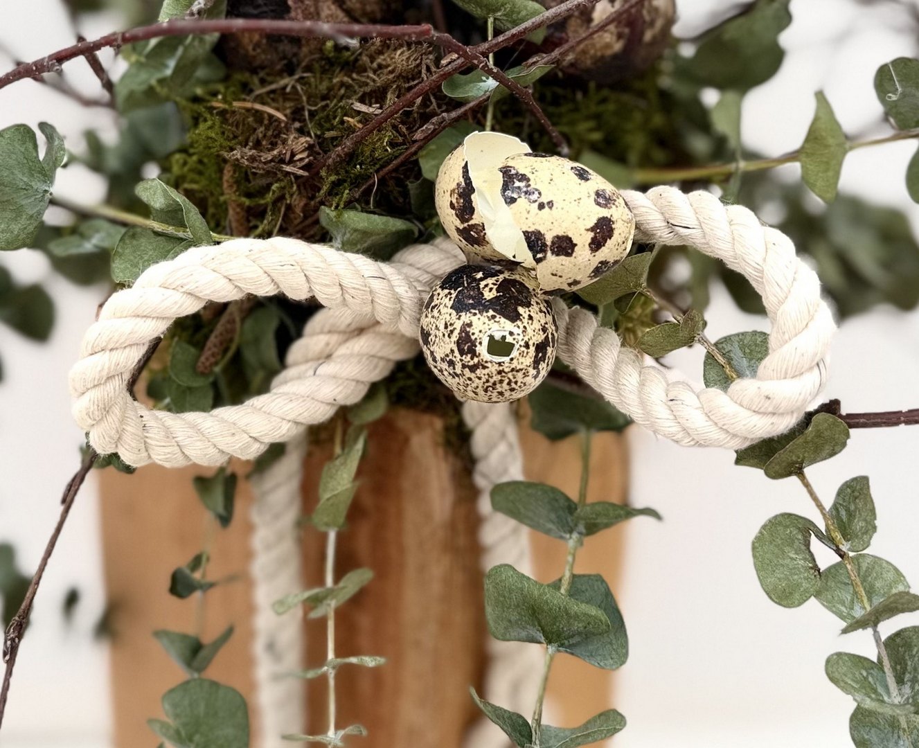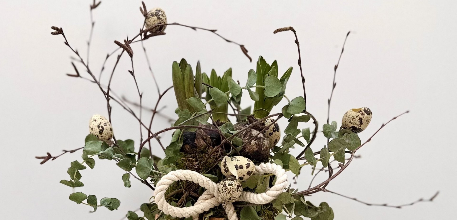 Materiaal: houten blok, oasis, baby bleu, berkentakjes, kwarteneitjes, hyacinten, touw.
