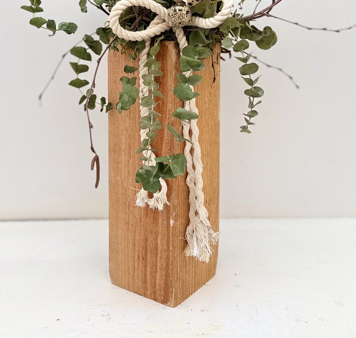 Een voorjaarstuk op een houten blok. Om zo gezellig het voorjaar in huis te halen.