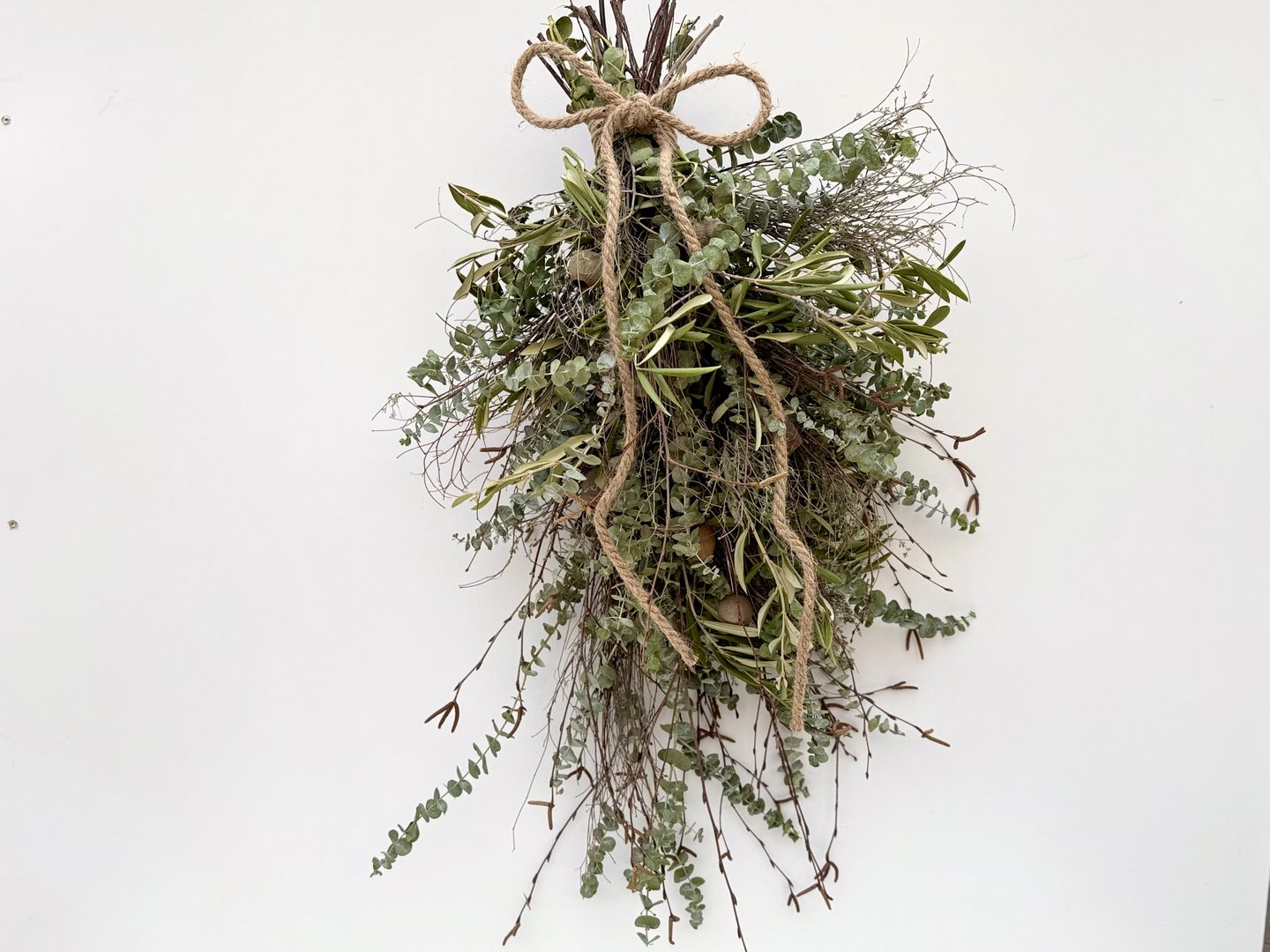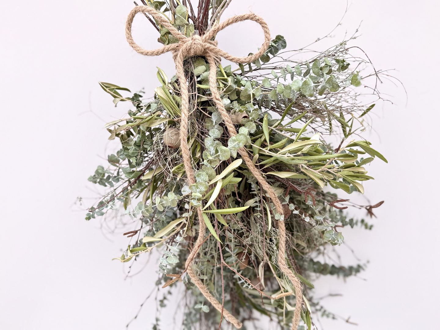 Materiaal: baby blue, thijm, olijfblad, berkentakjes en touw.